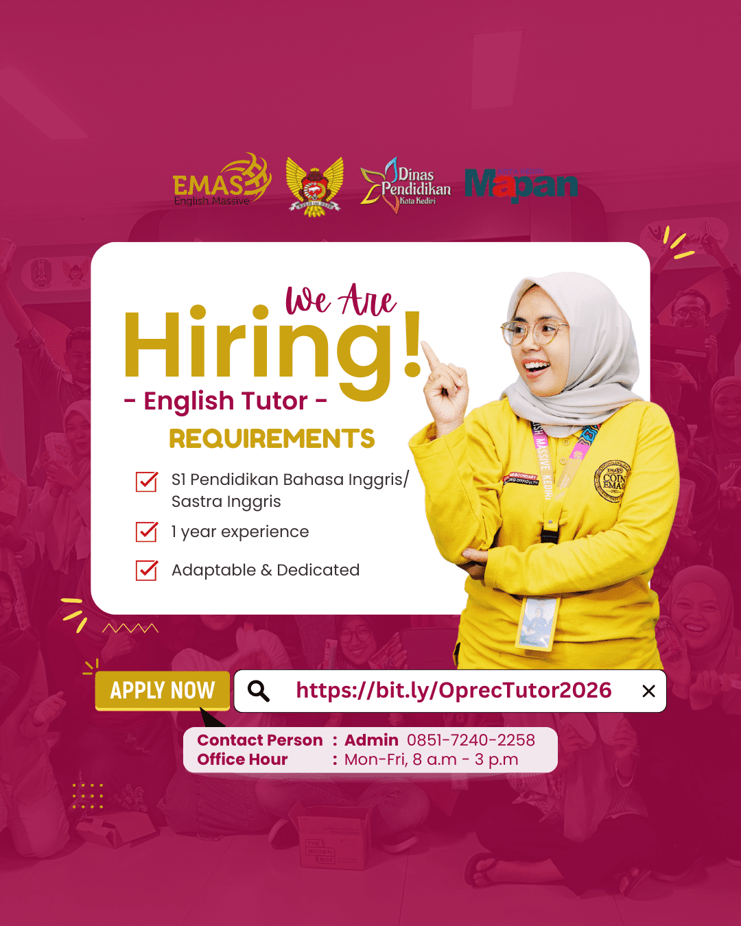 Saya sangat mendukung sekali program ini, karena sangat membantu warga di sekitar saya sehingga mereka termotivasi untuk belajar bahasa inggris. Saya harap untuk ke depannya akan ada belajar bersama (berbasis alam mungkin , atau semacam outbond) yang diikuti seluruh partisipan emas, sehingga anak-anak didik EMAS bisa saling mengenal dengan sesama partisipan emas dari wilayah lain.